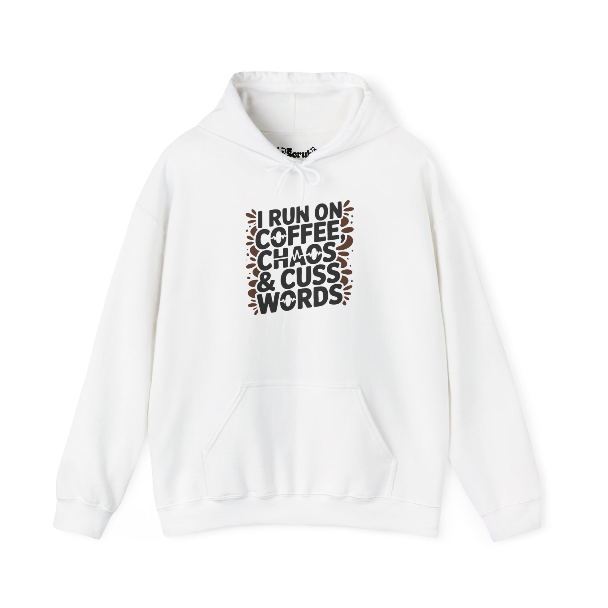 This cozy hoodie carries a cheeky, lived-in attitude — soft, warm, and built for busy mornings. The front shows a bold, hand-lettered square that reads “I RUN ON COFFEE, CHAOS & CUSS WORDS,” surrounded by tiny dash accents. It settles into the body with a classic cut, double-lined hood, and a roomy kangaroo pocket that keeps hands warm between sips of coffee or while juggling the day. Wear it layered over a tee or as your go-to at-home uniform when schedules are messy and humor is essential. The neutral print pops on light backgrounds and keeps the tone playful and honest — for people who don’t pretend the morning is graceful, they live it.